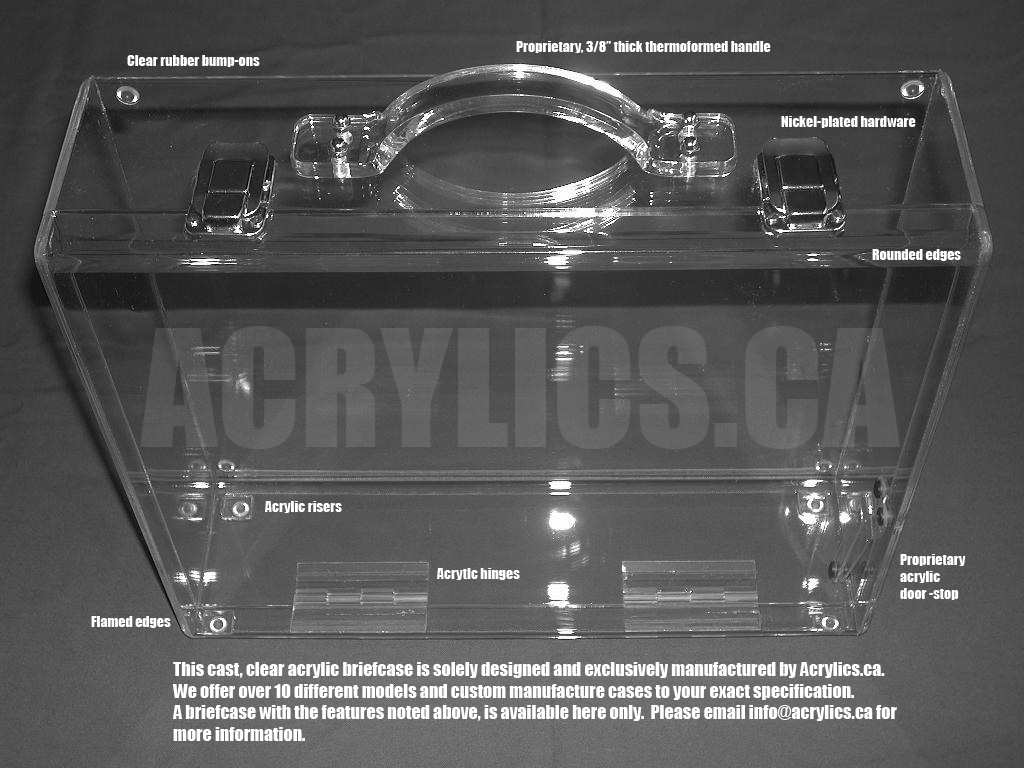 Acrylics.ca's new briefcase line includes super thin briefcases, security briefcases, contemporary briefcases, business briefcases, mini briefcases, portfolio cases of various sizes all in clear or colored acrylic or lexan (lucite or clear plastic). Transparent colors will include clear (our most popular) yellow, green, blue, red, orange and 3 shades of smoke (from light to dark). Opaque or non-transparent briefcase colors will include yellow, green, blue, red, orange, white and black. Minimum orders may be required for some colors.